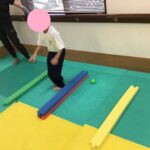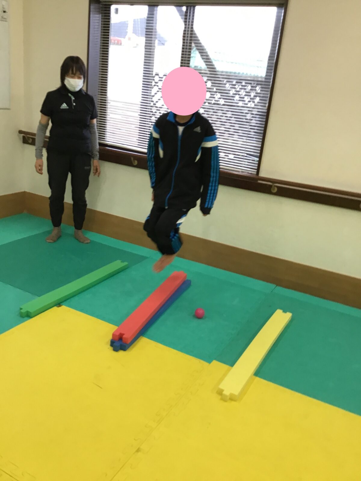 ボールをよく見て、転がってきたら隣のスペースへ両足でジャンプ!