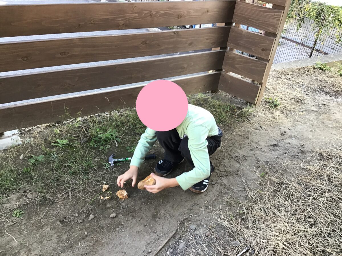庭にある大きい石を割って楽しんでいました!