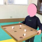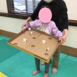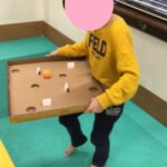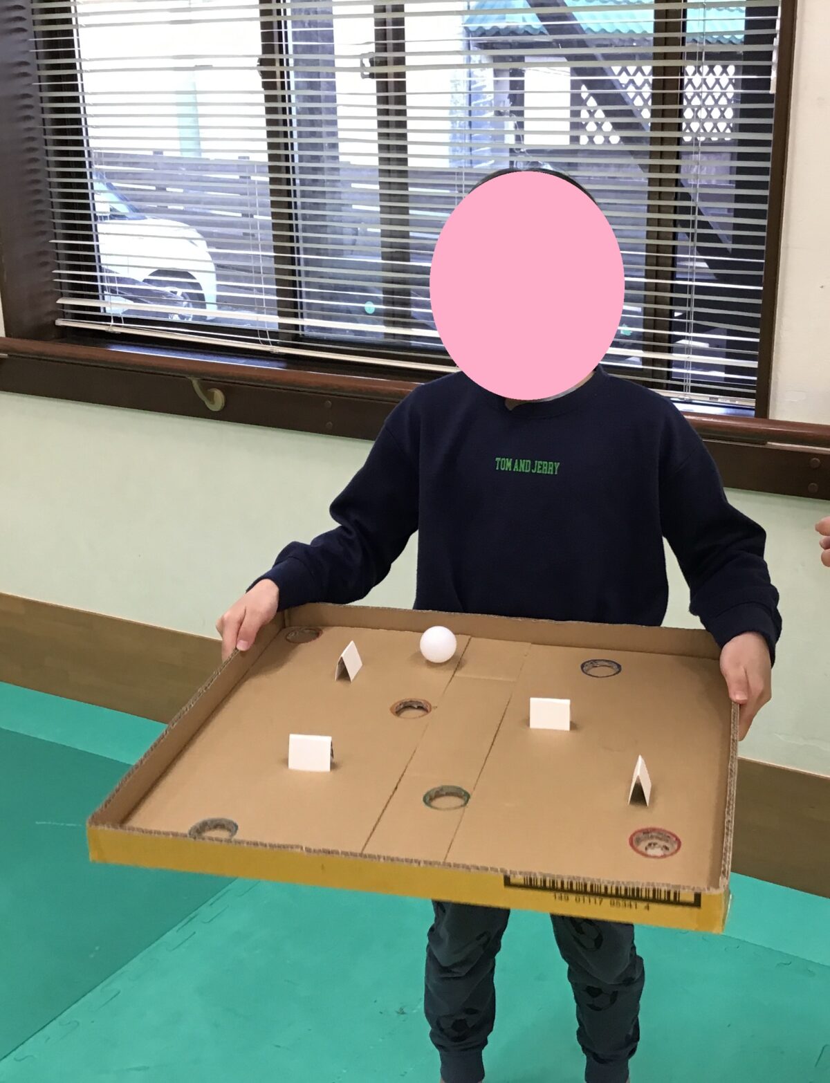 段ボールで作ったトレイを両手で抱え、ピンポン玉を穴に落とします。