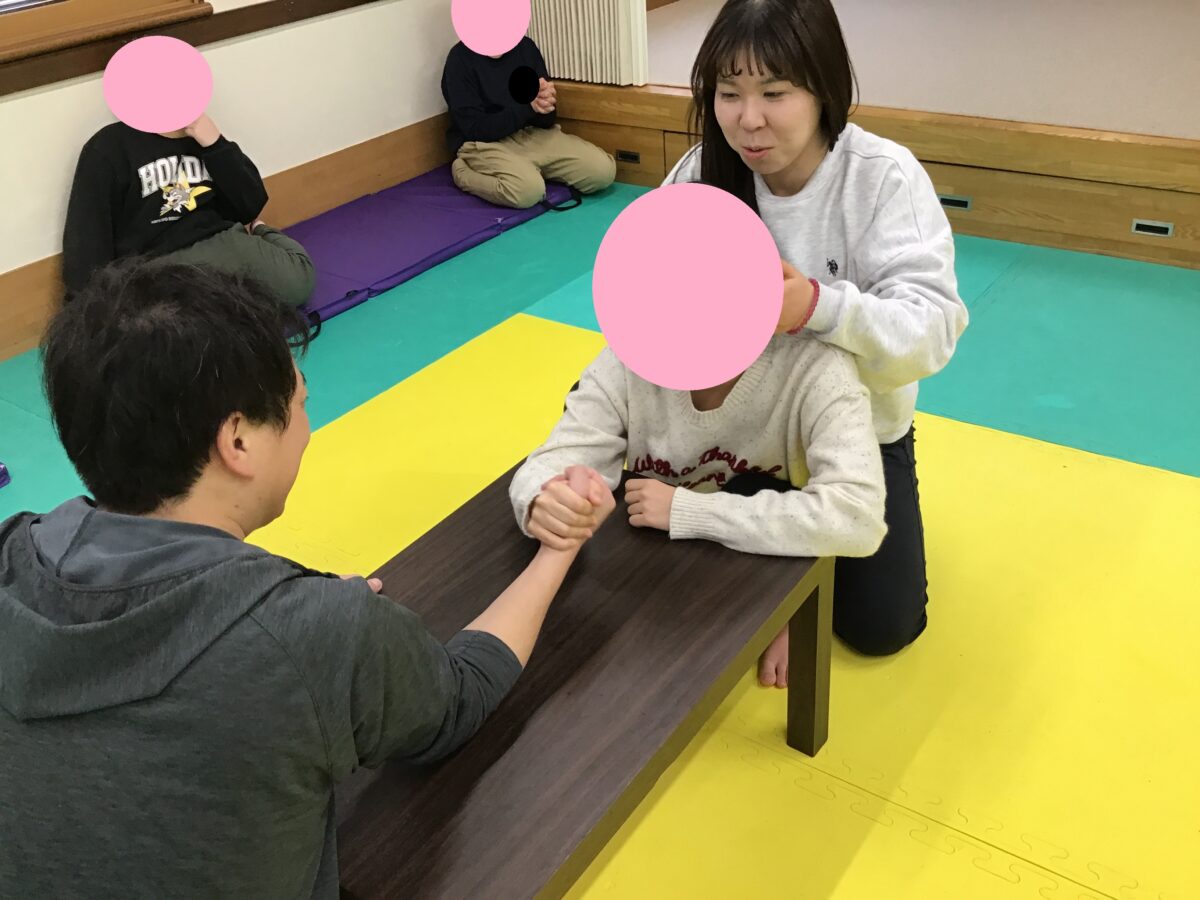 一番力がある男性スタッフに児童がチャレンジしましたよ