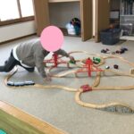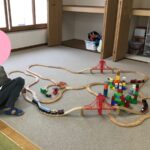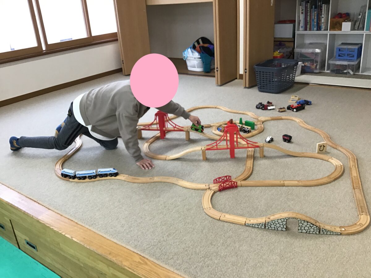 自由時間に線路を繋げて電車を走らせて遊ぶ姿がありました。