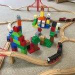 一度片付けて活動を行った後に「もう一度線路で遊びたい!」と言って、スタッフと一緒に街を作りました。